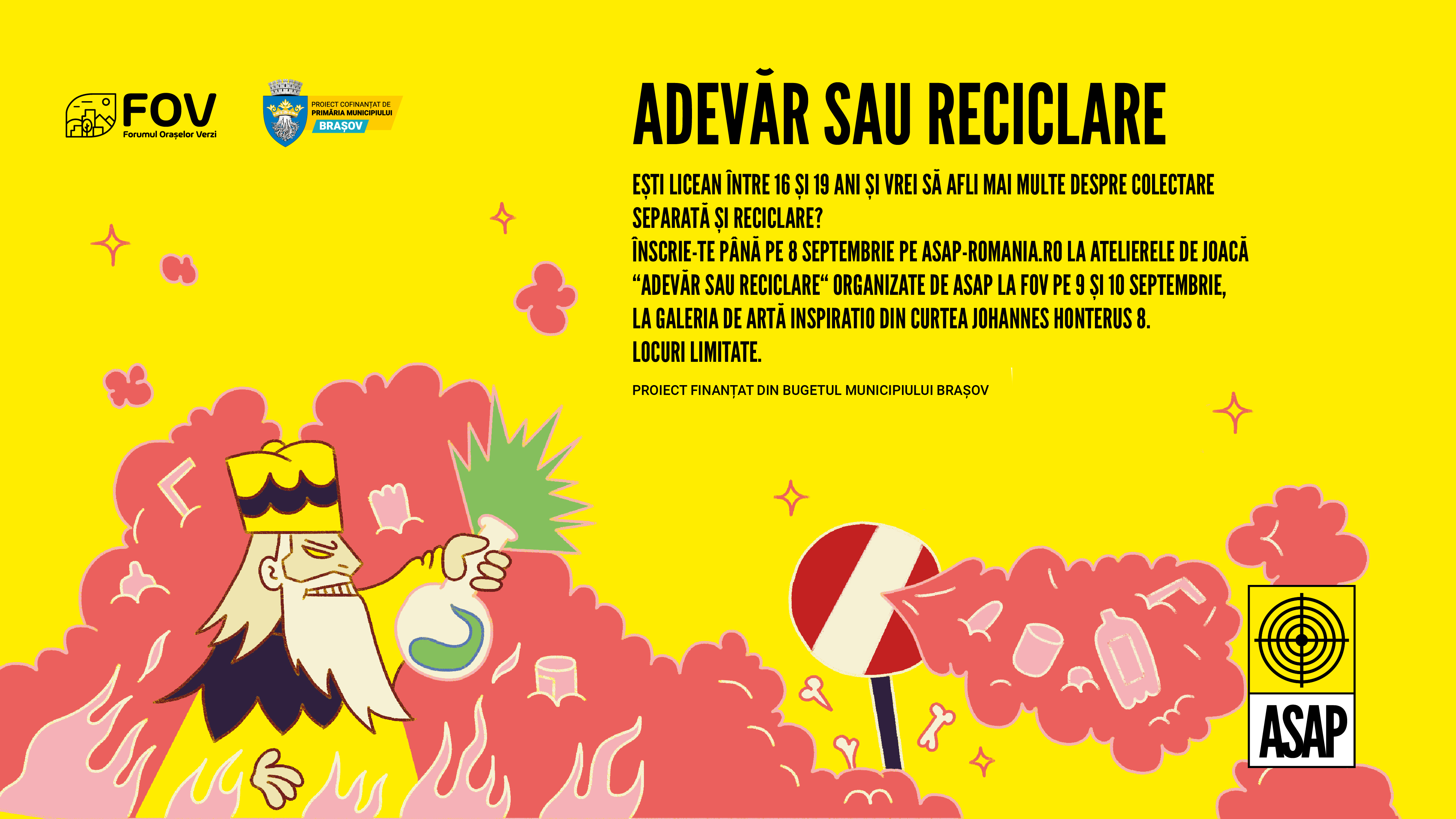 ASAP România (Armata Selectării Atente a Plasticului) îi invită pe liceenii din Brașov să participe la ateliere educative și interactive pe tema protejării mediului înconjurător. Pentru al treilea an consecutiv, ASAP România participă la Forumul Orașelor Verzi (FOV) și de această dată propune ateliere moderate de Alex Zamfir, bazate pe jocul Adevăr sau Reciclare.